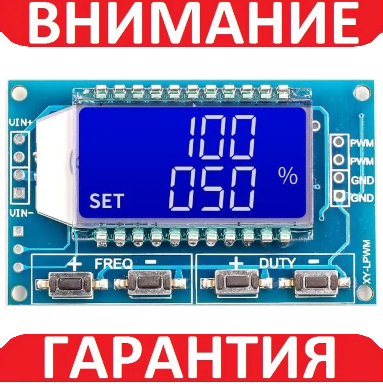 - Кнопки, позначені DUTY+ і DUTY-, використовуються для регулювання наснаги вихідного сигналу від 0 до 100% із кроком 1%;